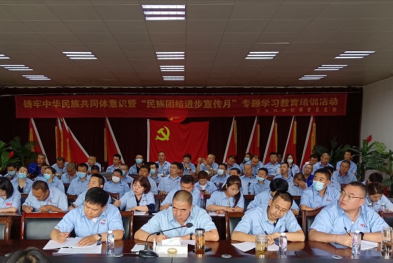 9月14日下午,三合村分公司党总支部组织开展铸牢中华民族共同体意识暨“民族团结进步宣传月”专题学习教育培训活动。会议特邀市委党校统战理论教研室副主任、副教授巴特尔老师进行系统授课。分公司全体党员、预备党员、发展对象、入党积极分子、工段长以上环节干部共计82人参加。